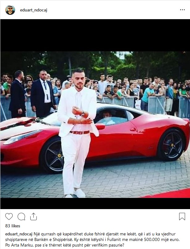Ka qenë Ndocaj ai që ka postuar një foto të Erikut me Ferrari, ndërsa ka thënë ndër të tjera se fshin djersët me lekët që babai i tij i vodhi shqiptarëve. ‘Një qurrash që kapërdihet duke fshirë djersët me lekët, që i ati u ka vjedhur shqiptareve në Bankën e Shqipërisë. Ky është këlyshi i Fullanit me makinë 500.000 mijë euro. Po Arta Marku, pse s’e thërret këtë pusht për verifikim pasurie?’, ka shkruar fillimisht deputeti kaubojs.