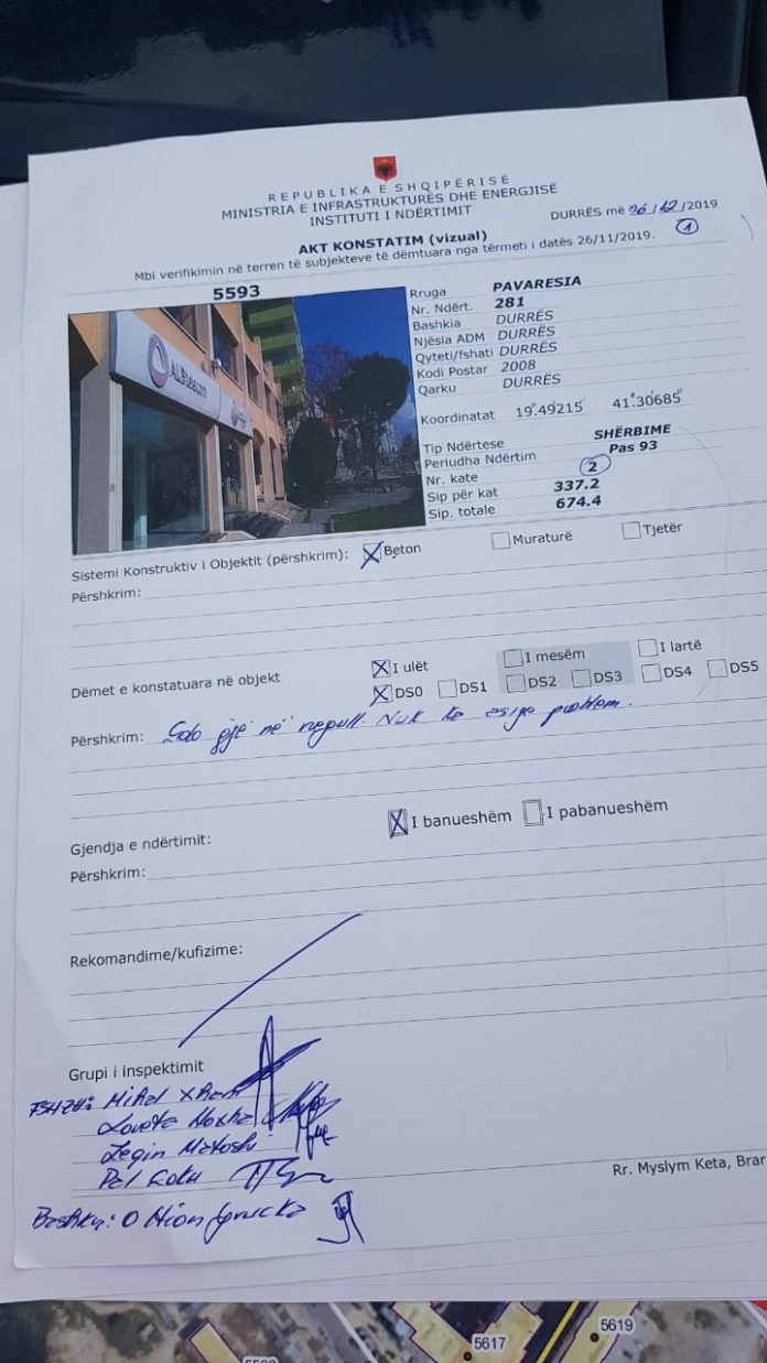 Ndër to, është edhe Posta Shqiptare në Durës, ku ditën e sotme është inspektuar nga nga FSHZH në bashkëpunim me inxhinierë sllovenë. Objekti, siç shihet edhe nga dokumenti, rezulton në rregull dhe qytetarët mund të tërheqin normalisht pensionet si dhe të marrin shërbimet e tjera nga ky institucion. /lexo.al