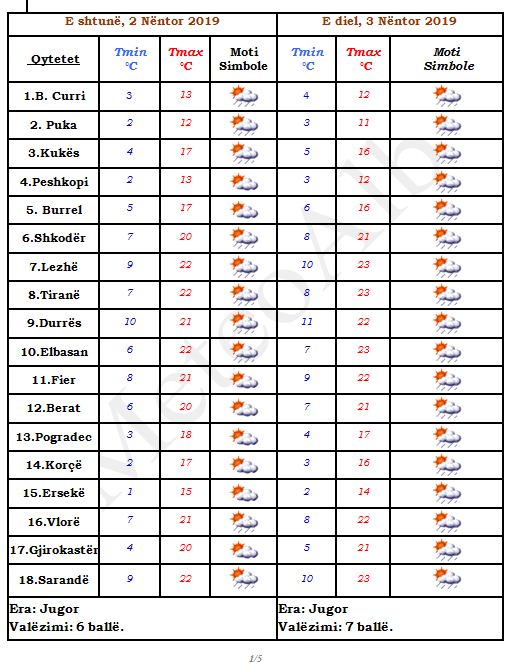 Sipas Meteoalb, temperaturat do të pësojnë një rënie të ndjeshme ku do variojnë: në zonat malore nga 01ºC deri në 11ºC, në zonat e ulëta nga 07ºC në 21 ºC dhe në zonat bregdetare nga 10C në 21ºC.