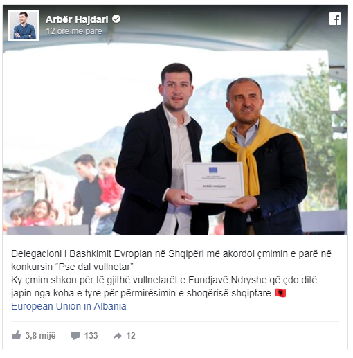 Ditën e sotme, në aktivitetin më të madh të Javës së Evropës 2019, ambasadori i BE-së në Tiranë, Luigi Soreca, i dorëzoi Hajdarit çmimin e parë në konkursin “Pse dal vullnetar”.