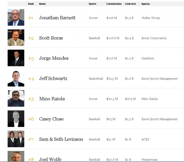 Forbes ka kryer një analizë në lidhje me agjentët e sporteve të ndryshme. Prestigjiozja amerikane ka bërë një renditje në bazë të komisioneve që përfitojnë agjentët e sportistëve. Në krye qëndron Jonathan Barnett, kreu i grupit “Stellar Group”.