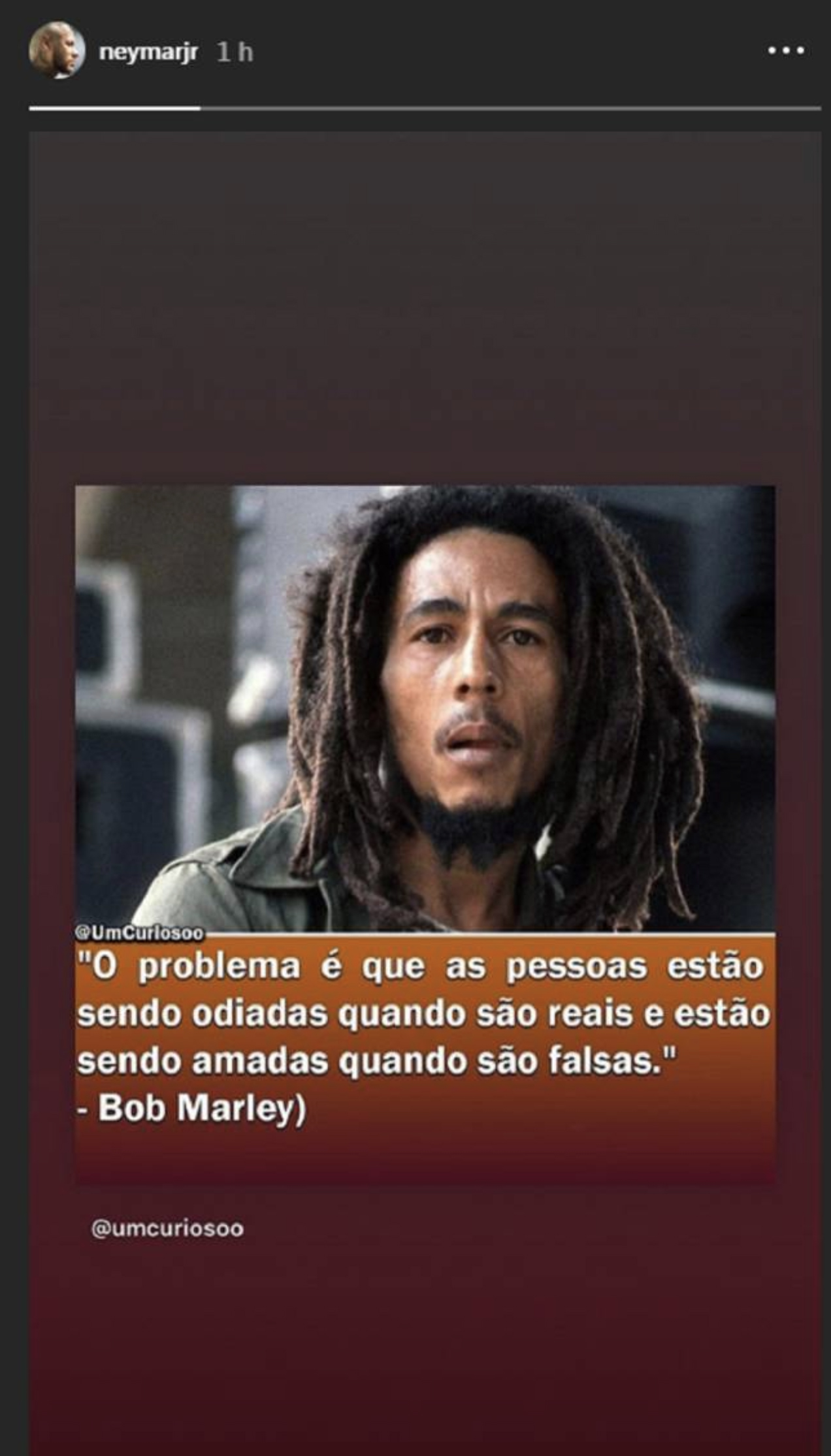 Në brendësi të “Instagram Stories”, braziliani ka cituar legjendën e këngës, Bob Marley, imazhin e të cilit ka publikuar, shoqëruar me frazën e tij:
