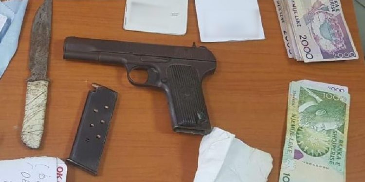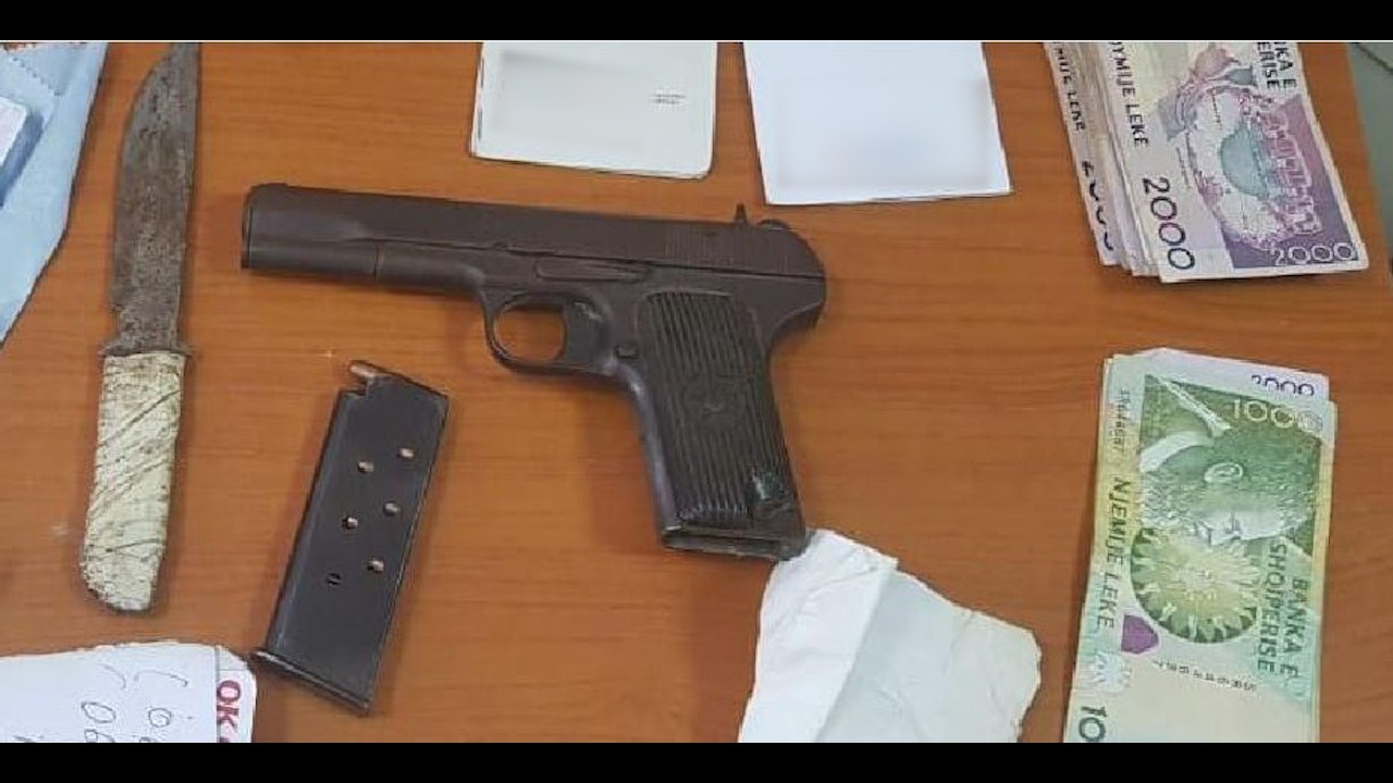 Gjatë kontrollit fizik, Policia i gjeti dhe sekuestroi një pistoletë tip TT me krehër dhe 7 fishekë, një mjet prerës “thikë” dhe një sasi lekësh.