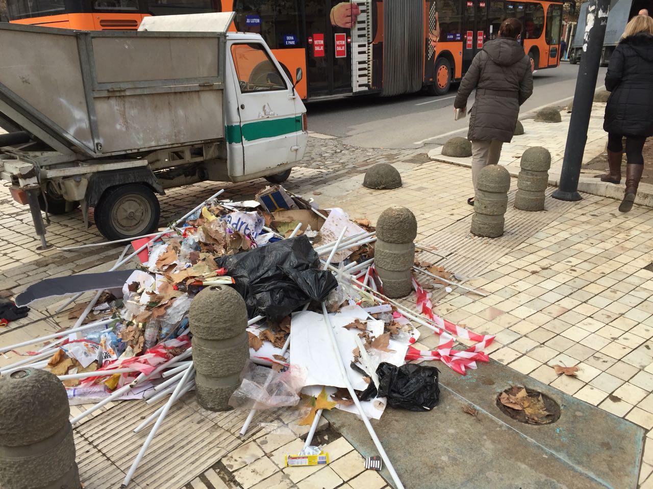 Pankarta, shkopinj, bidona me ujë, qese e fara ishin ajo që mbeti pas protestës së opozitës në rrugën “Xhorxh W Bush”, pranë hyrjes së sallës së seancave plenare.