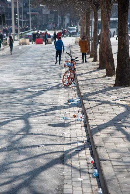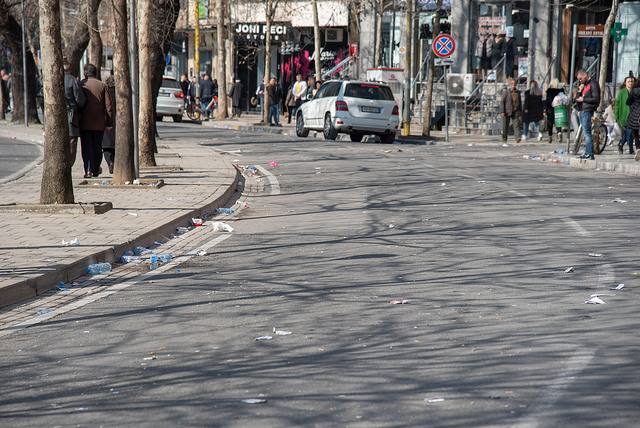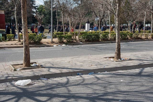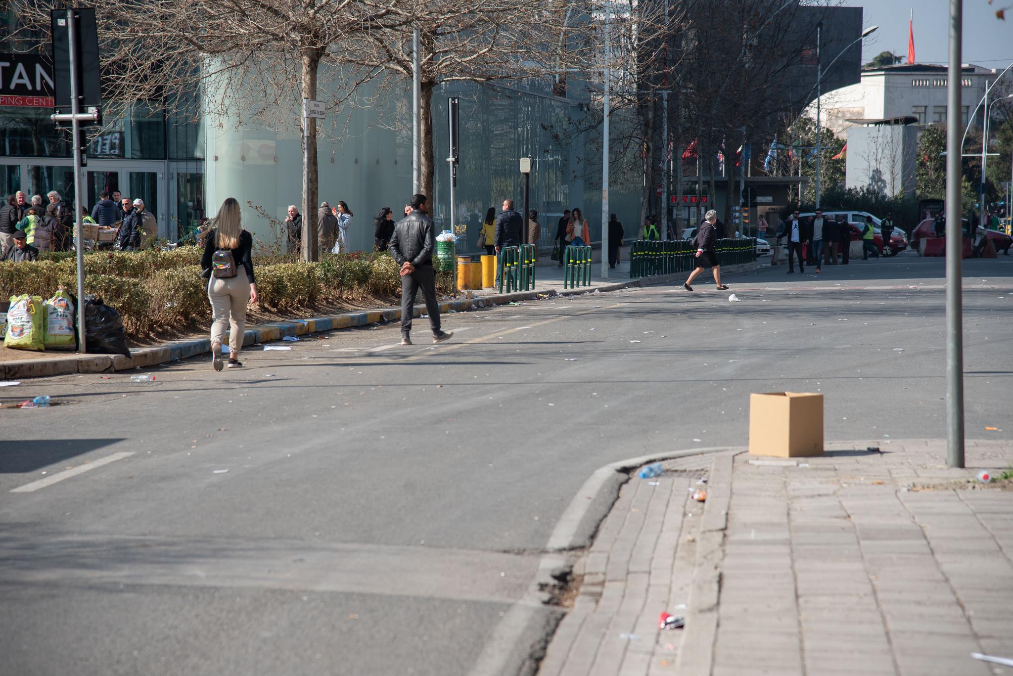 Bidona me ujë, qese dhe degë pemësh të thyera ishte panorama që ofronte direkt pas protestës së opozitës rruga dhe lulishtja pranë godinës së Seancave Plenare.