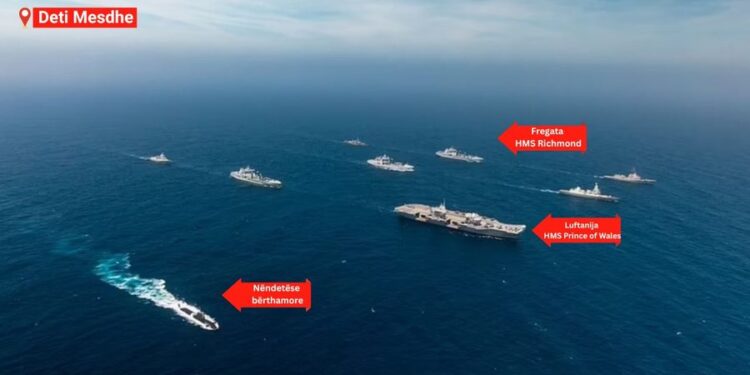Luftanija britanike HMS Prince of Wales, është fotografuar për herë të parë duke udhëhequr një nga flotat më të fuqishme në historinë e kohëve të fundit, në një mision që mund ta çojë në përplasje me forcat ushtarake të Kinës, shkruan Daily Mail.