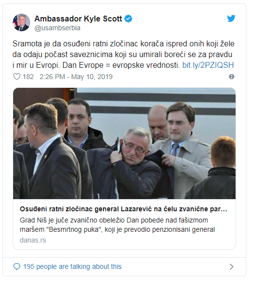 “Është një turp që një i dënuar për krime lufte të marshoj përpara atyre të cilët tregojnë respekt ndaj aleatëve të cilët vdiqën duke luftuar për paqe dhe drejtësi në Evropë. Dita e Evropës- Vlerat Evropiane”, ka shkruar Scott në profilin e tij zyrtar në Twitter.