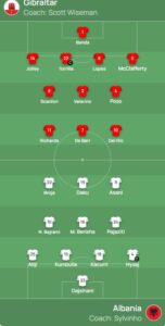 Në portë debuton Dajsinani, ndërsa në mbrojtje është Hysaj, Kacurri, Kumbulla dhe Aliji. Në mesfushë janë vendosur Medon Berisha, Pajaziti dhe Bajrami, ndërsa treshja e sulmit përbëhet nga Broja, Daku dhe Asani.