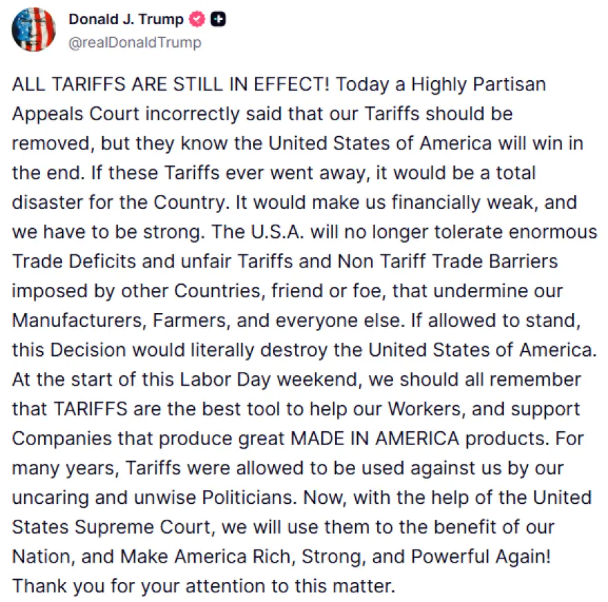 Vendimi, i marrë me 7 vota pro dhe 4 kundër, mund të vërë sërish në diskutim marrëveshjet që Trump ka nënshkruar me Bashkimin Europian dhe partnerë të tjerë tregtarë, si dhe tarifat e vendosura ndaj Kinës, Kanadasë dhe Meksikës. Megjithatë, ai nuk do të hyjë në fuqi para datës 14 tetor, duke i dhënë administratës Trump kohë për të paraqitur apel në Gjykatën e Lartë. Një apel që presidenti e ka paralajmëruar tashmë, duke sulmuar vendimin në rrjetin e tij Truth.