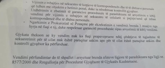 Në vendim, gjykata shprehet se në rastin konkret do të vijojnë të mbahen nën sekuestro vetëm kopjet që lidhen me hetimin penal, duke ia nënshtruar kontrollit gjyqësor.