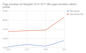 Prej vitesh Shqipëria është në kushtet kur paga mesatare në sektorin publik është shumë më e lartë se sa ajo në sektorin privat. Kështu, ndërsa vitin e kaluar të 165 mijë punonjësit e sektorit publik kishin paga bruto në masën 61,600 lekë në muaj, mesatarja e ekonomisë, ku përfshihet sektori publik dhe ai privat, e kishte pagën 48,967 lekë ose 20% më e ulët.