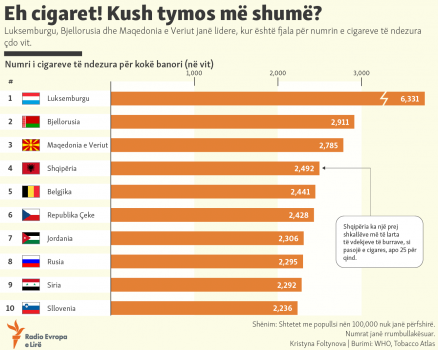 Rekordin për konsumin e cigares për banor e mban Luksemburgu, ndërsa më pas vjen Bjellorusia dhe Maqedonia e Veriut, ku trendi i konsumit shihet gjithmonë në rritje.