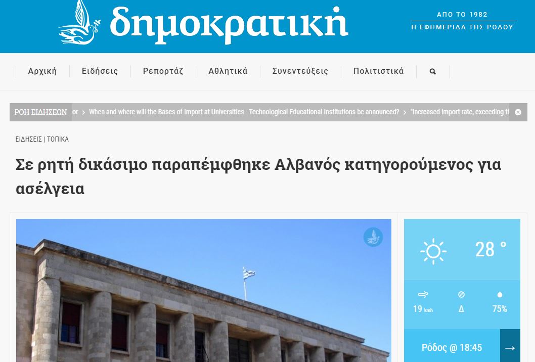Është liruar nga autoritet greke, shqiptari i arrestuar në Pefkos (Rodos) të Greqisë, të premten e javës së shkuar. Ai u vu në pranga nga efektivë të policisë së Rodosit pasi u akuzua nga një tursite britanike 21 vjeçe se kishte tentuar ta përdhunojë. Gjykata e Rodosit vendosi që hetimet ndaj shqiptarit të vijojnë në gjendje të lirë.