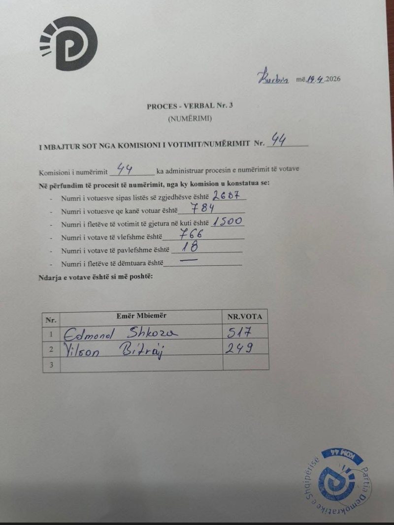 Ky është procesverbali i zgjedhjeve për kryetar të Partisë Demokratike në Kurbin.