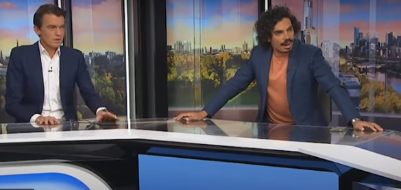 Gazetarët e ABC, Michael Rowland and Tony Armstrong nisin të shohin njëri-tjetrin në sy pas lëkundjes.
