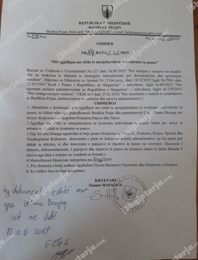 Shqiptarja.com siguron dokumentin që i është paraqitur Albana Dragës, me vendimin e shkarkimit nga puna. Por ky dokument, në hartimin e tij ka paqartësi dhe kontradikta. Në pikën e parë, thuhet se miratohet dorëheqja e zonjës Albana Draga, që mbante postin drejtoreshë në kopshtet Përparim, Pajovë dhe Sheze, ndërkohë që ajo përgënjestron në mënyrë absolute që ka dhënë dohëreqjen.