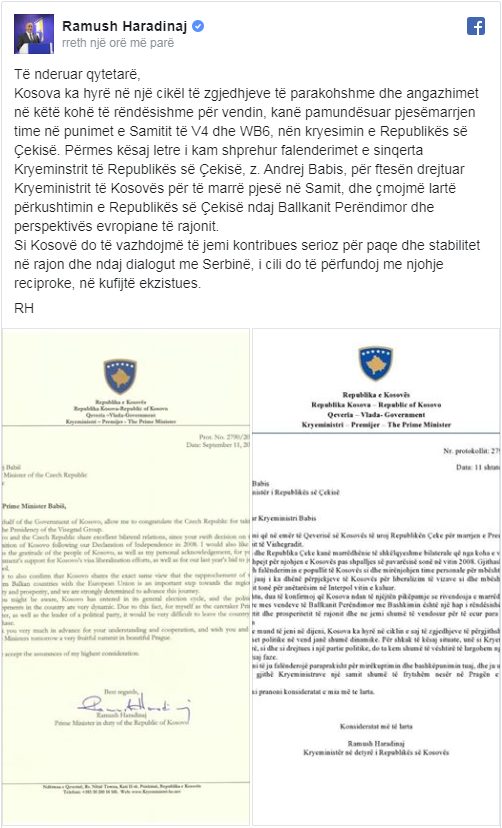 Në një reagim në profilin e tij në rrjetin social “Facebook”, Haradinaj ka thënë se përmes një letre e ka njoftuar edhe kryeministrin çek, Andrej Babis, për një vendim të tillë.