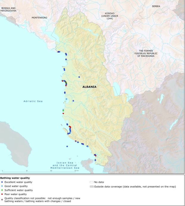Plazhet që janë vlerësuar me notën “dobët” janë 12 të tilla, nga 102 plazhe gjithsej. Në faqen e internetit të agjensisë europiane, është paraqitur edhe një hartë, që mund ta shihni më poshtë, nga ku gjithsesi është e vështirë të kuptohen plazhet ekzakte që janë vlerësuar me notën “dobët”.