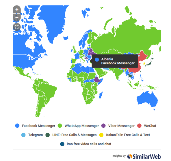 Sipas një raporti të ri të SimilarWeb tregohet se Messengeri i Facebook ka marrë vendin e parë në një numër territoresh të reja dhe tani është aplikacioni kryesor i mesazheve në 58 vende. Sipas raportit, Viber ka humbur terren duke lënë vendin e tij si aplikacioni i kryesor i mesazheve në Shqipëri, Irak dhe Maqedoni tek i Dërguari, ndërsa WhatsApp-i u shndërrua më i përdorur në Kroaci.