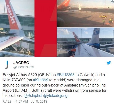Një aksident njoftohet të ketë ndodhur sot në aeroportin ‘Schiphol’ të Amsterdamit, ku u përplasën aeroplani i kompanisë ‘Easy Jet’ A320 dhe ‘KLM Boing’ 737-800.