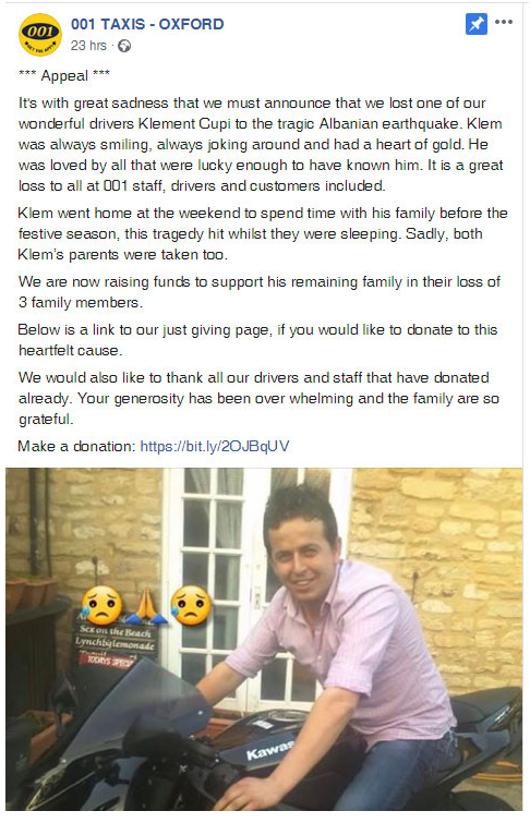 “Me trishtim të madh ju njoftojmë se kemi humbur një nga shoferet tane të mrekullueshëm Klement Cupi në tërmetin tragjik ne Shqiperi. Klemi ishte gjithnjë i buzëqeshur, me humor dhe kishte nje zemer flori. Ai ishte i dashur nga të gjithë ata që kishin fat ta njihnin. Ishtë një humbje e madhe për të gjithë në stafin 001, shoferët dhe klientët tane.