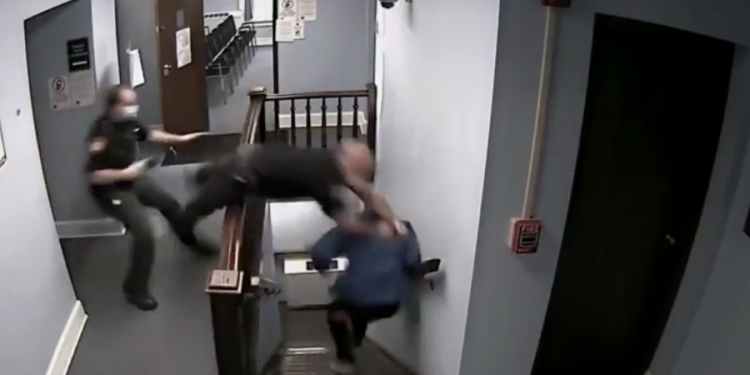 Një nga policët hidhet nga shkallët për ta ndaluar, por më kot.