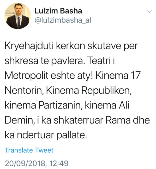 Lulzim Basha i është përgjigjur akuzave të përcjella nga kryeministri Edi Rama nga foltorja e Kuvendit duke publikuar dokumentin kompromentues ku në vitin 2013 Basha në cilësinë e kryetarit të Bashkisë së Tiranës, firmosi privatizimin e godinës së Teatrit të Metropolit, me qëllim që atë ndërtesë t’ia jepte deputetit të PD-së Astrit Veliaj.