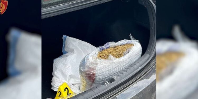 “Nga kontrolli i ushtruar në bagazhin e automjetit që drejtonte 19-vjeçari, shërbimet e Policisë gjetën një qese të mbushur me rreth 5 kg lëndë të dyshuar narkotike cannabis sativa, sasi e cila u sekuestrua në cilësinë e provës materiale së bashku me automjetin dhe me celularë të të arrestuarit”, thuhet në njoftim.