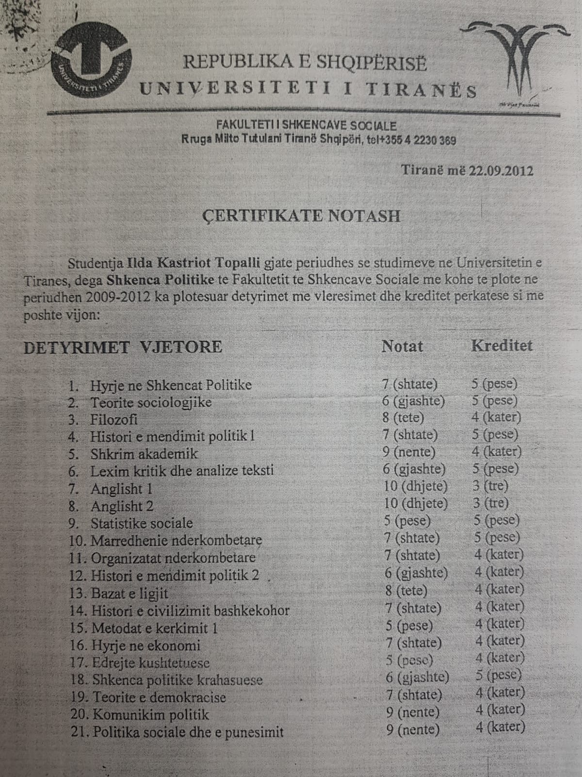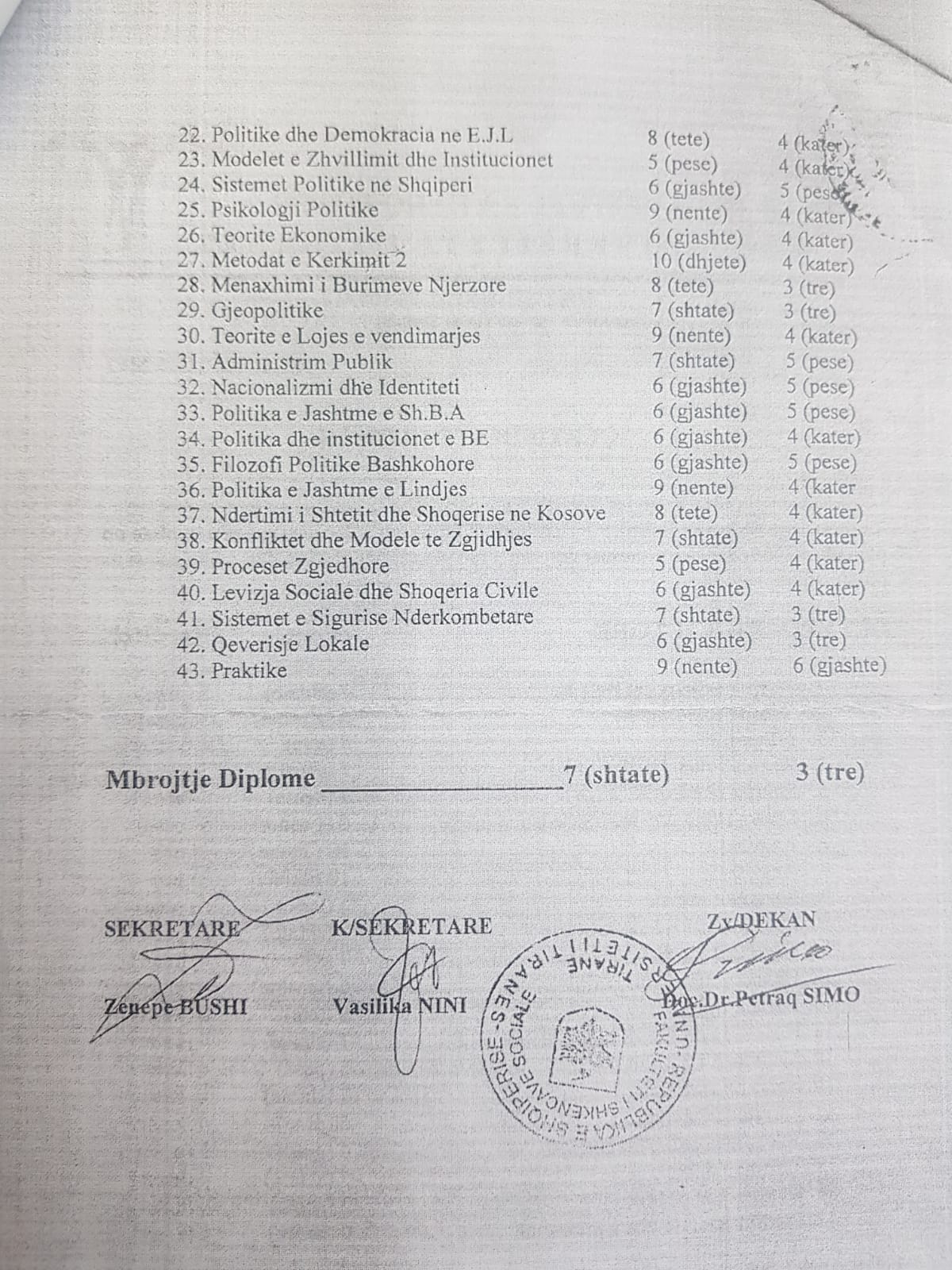 Madje, edhe ne, mbrojtjen e diplomes, Topalli ka marre 7, nje note qe eshte larg ekselences. /Marrë nga lexo.al