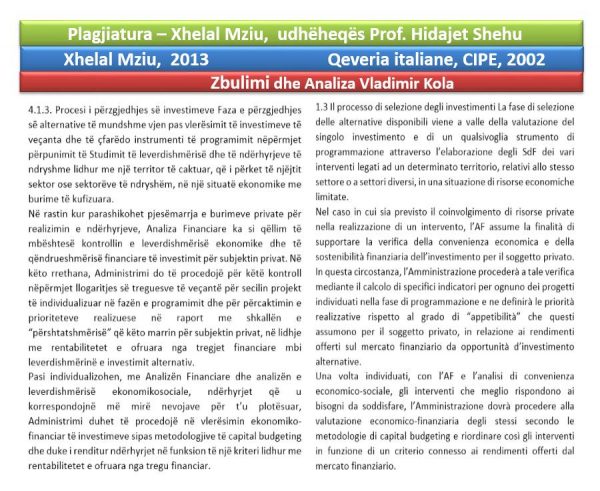 “Zbulimi dhe analiza e Tezës së doktoraturës me plagjiaturë me titull “Vlerësimi i leverdishmërisë ekonomiko-financiare për realizimin dhe administrimin e investimeve publike, studim rasti”, e mbrojtur nga Xhelal Mziu në vitin 2013, pranë Fakultetit të Ekonomisë dhe Agrobiznesit, Universiteti Bujqësor i Tiranës, me udhëheqës shkencor Prof. Hidajet Shehu.
