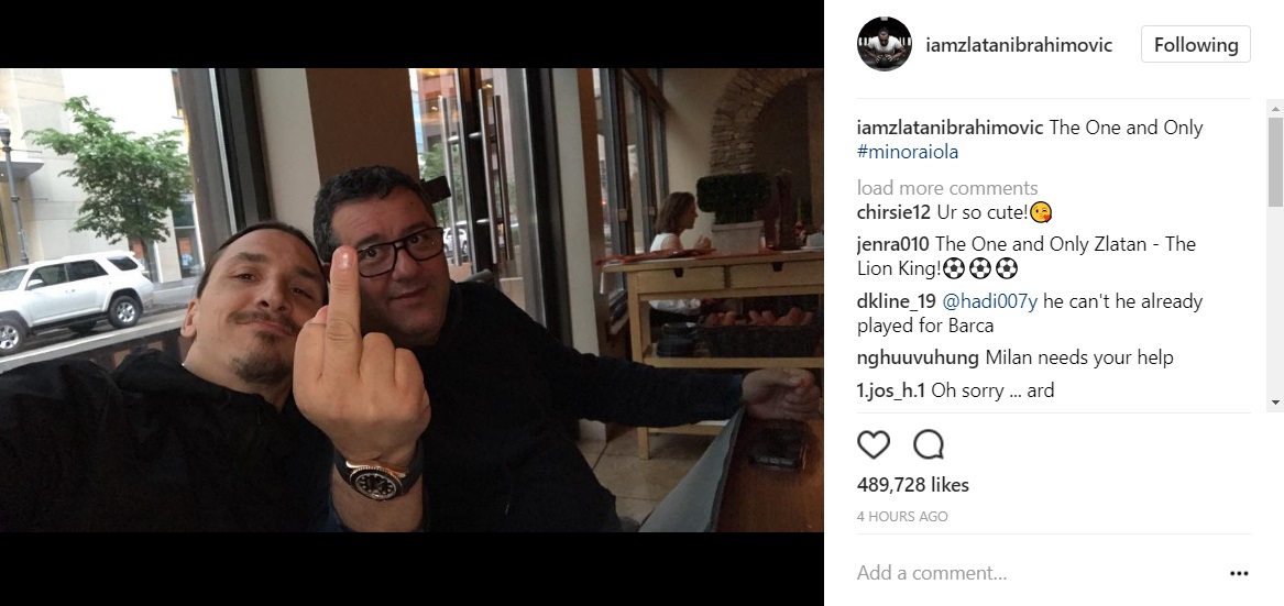 Pas kësaj, Ibra publikoi një foto me agjentin e tij në rrjetet sociale, duke shkruar: “Një dhe i vetmi Mino Raiola”.