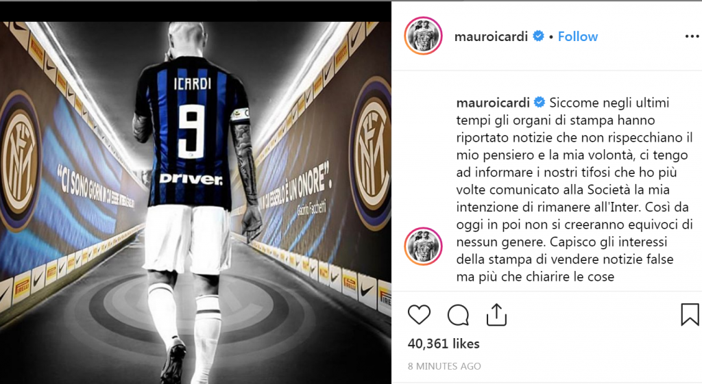 “Meqenëse kohët e fundit, organet e shtypit kanë dhënë lajme që nuk pasqyrojnë mendimin tim dhe vullnetin tim, më duhet të informoj tifozët tanë se disa herë i kam komunikuar shoqërisë qëllimin tim për të qëndruar tek Interi. Kështu, nga sot e tutje, nuk do të krijohen keqkuptime të asnjë lloji. E kuptoj interesin e shtypit për të shitur lajme të rreme më shumë se për të sqaruar gjërat.”/ i.h