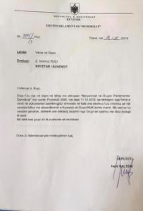 Ne mesin e firmëtarëve rezulton edhe deputeti Halit Valteri, i cili është njëkohësisht nënkryetari grupit. Por nëpërmjet një letre që i ka dërguar kryeparlamentarit Gramoz Ruçi, Valteri thekson se është tërhequr nga firma dhe se nuk ka një vendim për shkarkimin e Rudina Hajdarit.