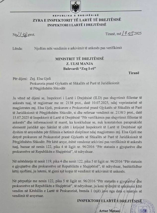 Në një letër drejtuar Ministrit të Drejtësisë Ulsi Manja, ILD bën me dije se pas verifikimeve paraprake të ankesës së dorëzuar më 10 korrik 2025, nuk janë konstatuar elementë juridikë apo faktikë që të ngrejnë dyshime të arsyeshme për nisjen e hetimit disiplinor ndaj magjistrates Gjeli.