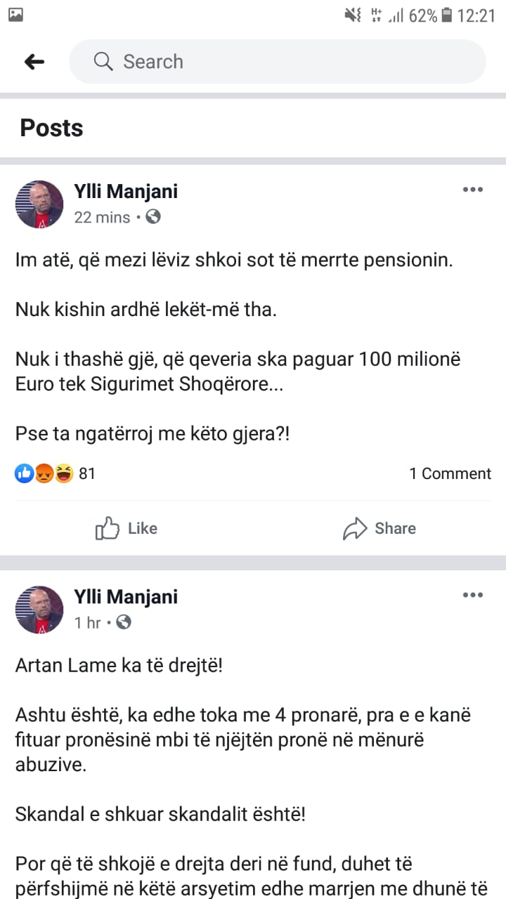 Ditën e sotme Ylli Manjani ka shpërndarë një status me anë të të cilit thoshte se i ati nuk kishte marrë pensionin dhe shkak ishte qeveria që nuk kishte paguar sigurimet.