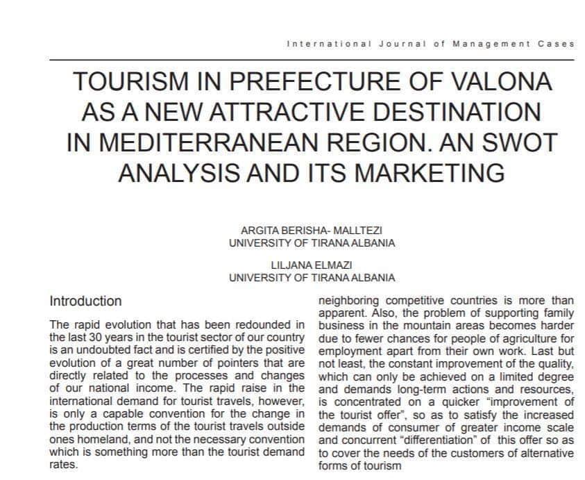 Tourism in prefecture of Valona as a new attractive destination in mediterranean region. An swot analysis and its marketing. Argita Berisha- Malltezi, University of Tirana, Albania; Liljana Elmazi, University of Tirana, Albania