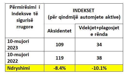 Pas konvertimit të mësipërm, indeksi i aksidenteve të 10-mujorit rezulton të ketë qenë 108 aksidente për qindmijë automjete aktive, ose 8.4% më i ulët se në 10-mujorin e vjetshëm. Ndërsa indeksi i vdekjeve+plagosjet e rënda rezulton të ketë qenë 34 vdekje+plagosje të rënda për qindmijë automjete aktive, ose 10.1% më i ulët se në 10-mujorin e vjetshëm (shihni tabelën shoqëruese).