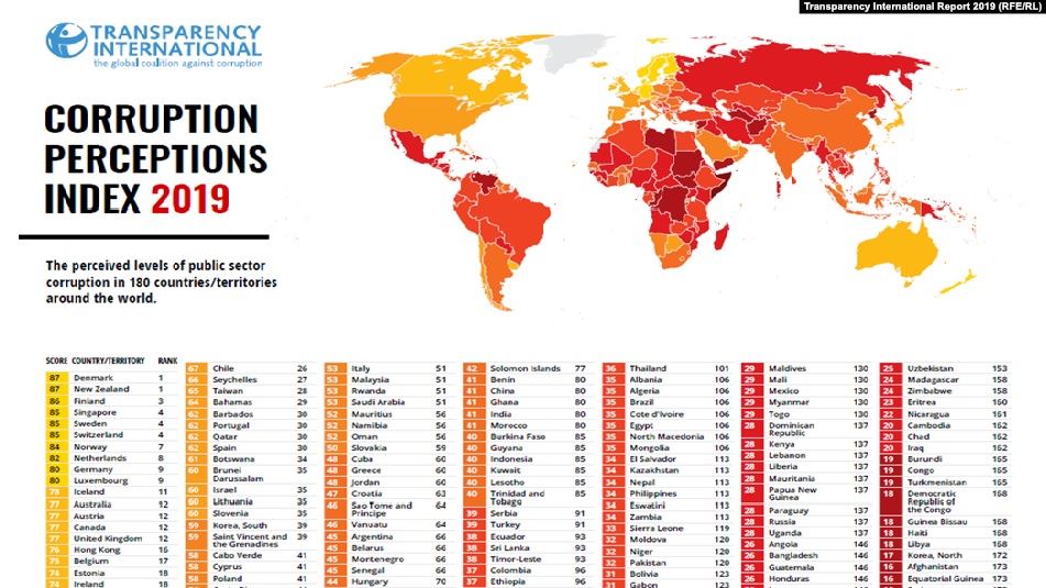 Indeksi radhit 180 vende dhe territore të botës në bazë të nivelit të perceptuar të korrupsionit në sektorin publik. Ai përdor një shkallë prej zero pikësh deri në 100, ku zero tregon për një vend shumë të korruptuar, ndërsa 100 një vend shumë të pastër.
