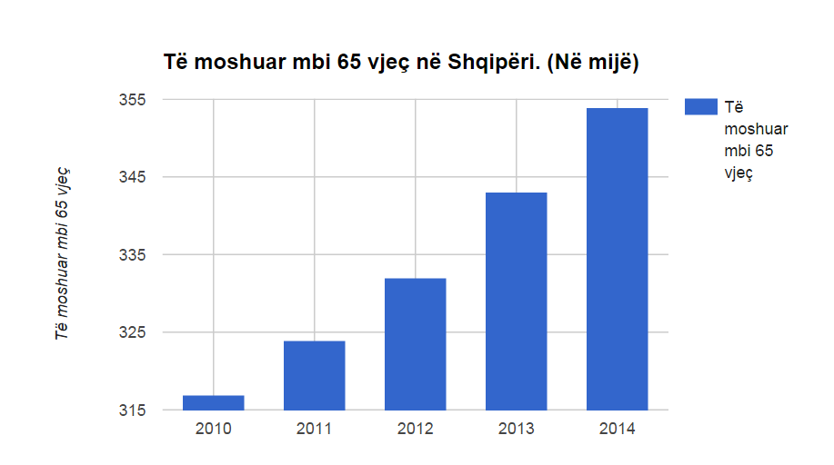 Në të njëjtën kohë, numri i të moshuarve mbi 65 vjeç, u rrit në 354 mijë vetë, 11 mijë më shumë se sa një vit më parë dhe 37 mijë më shumë se sa në vitin 2010. Numri i të moshuarve ka ardhur në rritje në Shqipëri si pasojë e rritjes së jetëgjatësisë në vend.