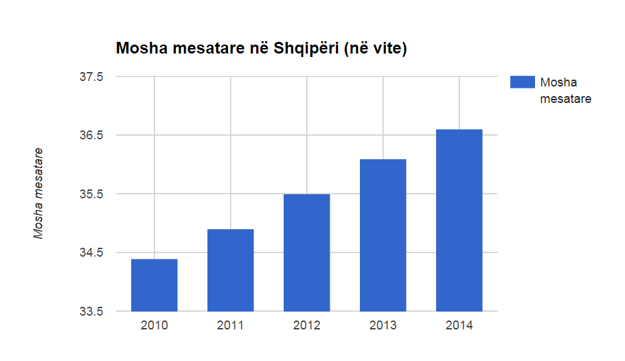 Në të njëjtën kohë, mosha mesatare e Shqipërisë, sipas llogaritjeve të INSTAT, u rrit në 36.6 vjeç, nga 34.4 vjeç që qe në vitin 2010. Rritja e moshës mesatare të popullsisë ka ardhur pjesërisht si pasojë e rënies së numrit të lindjeve në vend dhe pjesërisht si pasojë e emigrimit masiv të viteve të fundit, emigrim që ka gërryer më shumë popullsinë e re.