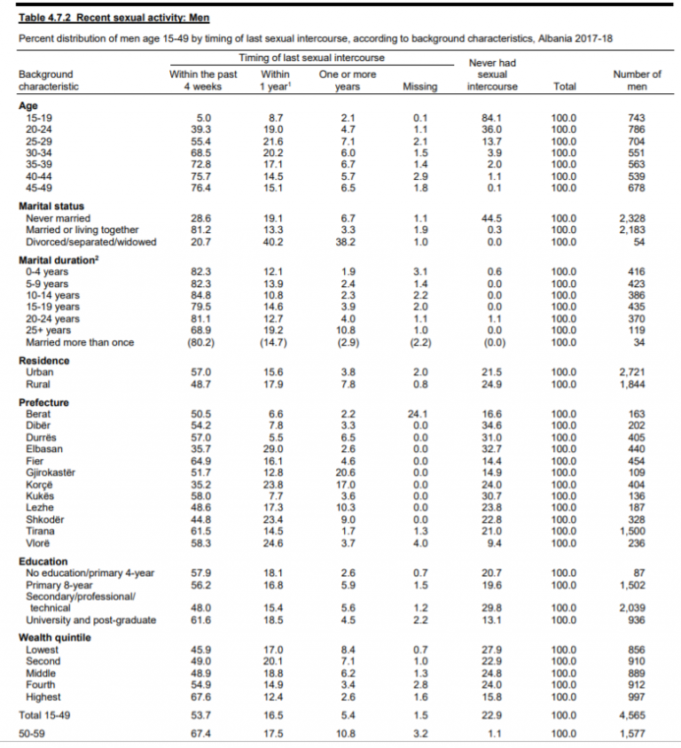 Një anketë e përbashkët e INSTAT dhe Institutit të Shëndetit Publik e zhvilluar në rreth 16 mijë familje shqiptare në mes shtatorit 2017 dhe shkurtit 2018 gjeti se, 24 për qind grave në moshën 15-49 vjeç dhe 23 për qind e burrave në këtë grup moshë nuk kanë kryer asnjëherë marrëdhënie seksuale.
