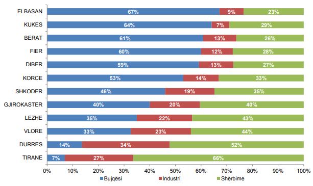 Ndryshe ndodh me bujqësinë, ku Tirana mbetet në vend të fundit sa i përket të punësuarve në këtë sektor me vetëm 7 %.