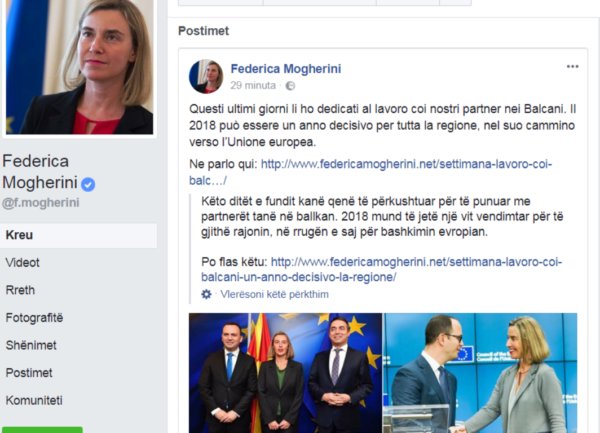 Viti 2018 mund të jetë një vit vendimtar për të gjithë rajonin e Ballkanit, në rrugën për në Bashkimin Europian, ka deklaruar Federica Mogherini në statusin e saj Facebook.
