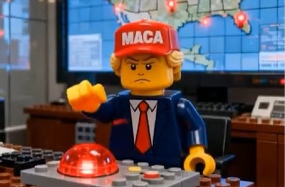 Le të marrim këtë video në Instagram: personazhi biond me kapele të kuqe dhe me pamje djaloshi të trashë, naiv por i keq, është qartësisht Donald Trump. Si një fëmijë kapriçioz pas tavolinës së Zyrës Ovale, ai është gati të shtypë një buton të kuq për të shkatërruar një central elektrik iranian, pasi sapo ka shkatërruar një urë. Imazhi është i shpejtë, i stilit vizatimor, shumë i gjallë dhe plot ngjyra; personazhet dhe ambienti janë rikrijuar si një film Lego i bërë nga inteligjenca artificiale.