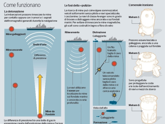 Me situatën e krijuar rreth Hormuzit, iranianët mund të kenë shumë armë në dispozicion, duke qenë se janë përgatitur për këtë skenar. Ekzistojnë disa lloje minash në dispozicion të një Marine. Minat mund të vendosen në fundin e detit. Të ankoruara në një “kuotë” të caktuar falë një kablli të lidhur me një zavorr në fund. Të lëvizshme, pra që notojnë.