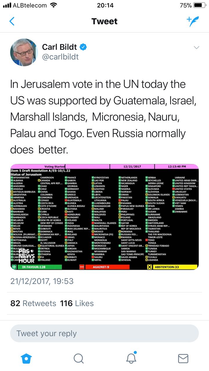 “Në votimin e sotëm për Jeruzalemin në OKB, SHBA u mbështet nga Guatemala, Ishujt Marshall, Macronesia, Nauru, Palau dhe Togo. Edhe Rusia do të dilte më mirë…” – shprehet Calr Bildt. /JavaNews/b.d