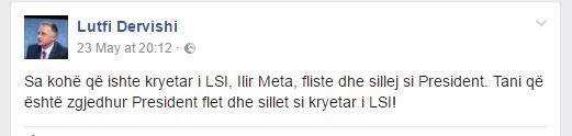 Zgjedhja e Ilir Metës si president vijon të ironizohet në rrjetet sociale. Përmes një statusi në Facebook, gazetari Lutfi Dervishi shkruan se sa kohë që ishte kryetar i LSI, Ilir Meta, fliste dhe sillej si President. Sipas tij, tani që është zgjedhur President flet dhe sillet si kryetar i LSI.