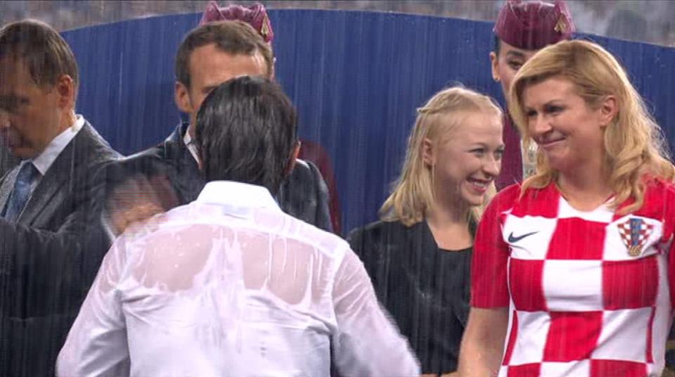 Ai u fiksua nga kamerat teksa të ruhej me çadër nga badigardët e tij, ndërsa dy lideret e tjerë, Presidenti i Francës dhe ajo e Kroacisë, kane festuar në shi.