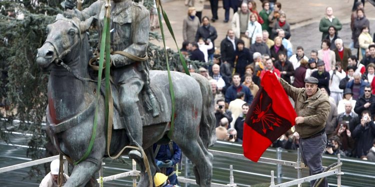 Pa shumë zhurmë, një grup punëtorësh hoqën statujën duke përdorur një gërmues mekanik dhe mjete të rënda për të hequr platformën me tulla në të cilën qëndronte statuja, përpara se ta ngrinin atë me një zinxhir.