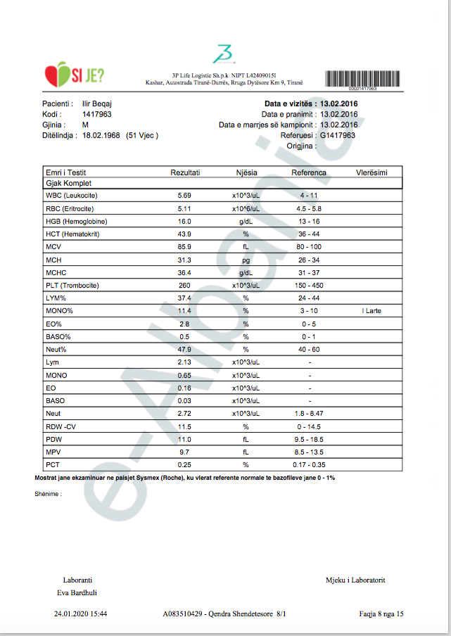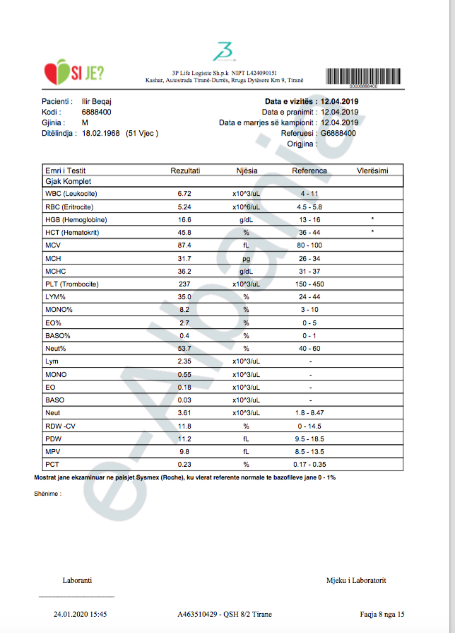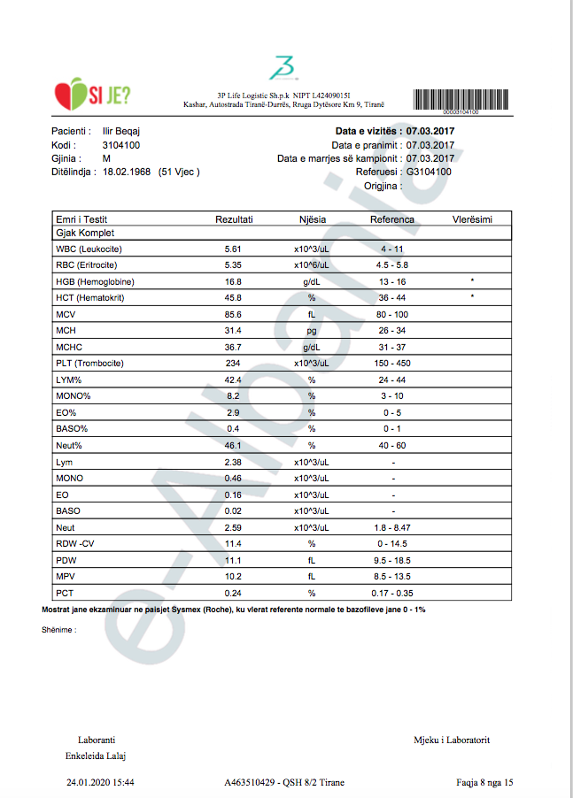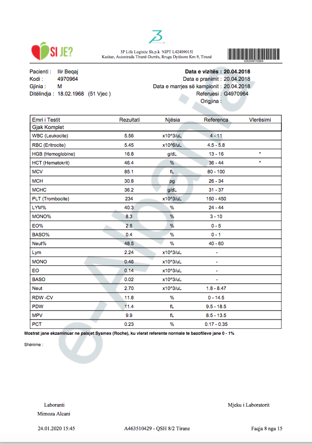 Siç e shpjegova edhe më sipër, data në fund të faqes është data kur është printuar ai dokument. Ai kontroll mund të jetë kryer kurdo. Një gjë është e sigurtë që në nuk është kryer në datë 06.01.2020. Kjo për faktin e thjeshtë se nga kryerja e kontrollit deri në dhënien e përgjigjes së vlerësimit të gjendjes kalojnë rreth 14 ditë. Pra, ai kontroll është kryer para datës 23 dhjetor 2019, por mund të jetë kryer edhe në vite të mëparshme. Në një distancë kohore 2 javore edhe në të njëjtin laborator për të njëjtin individ treguesit e gjakut mund të jenë të ndryshëm.